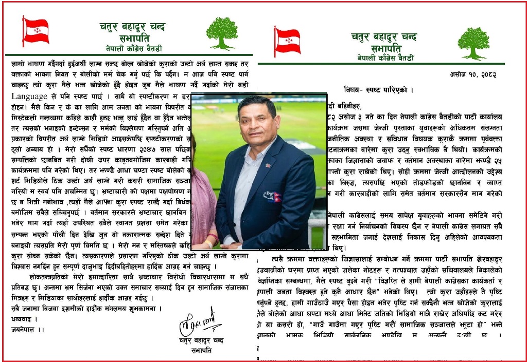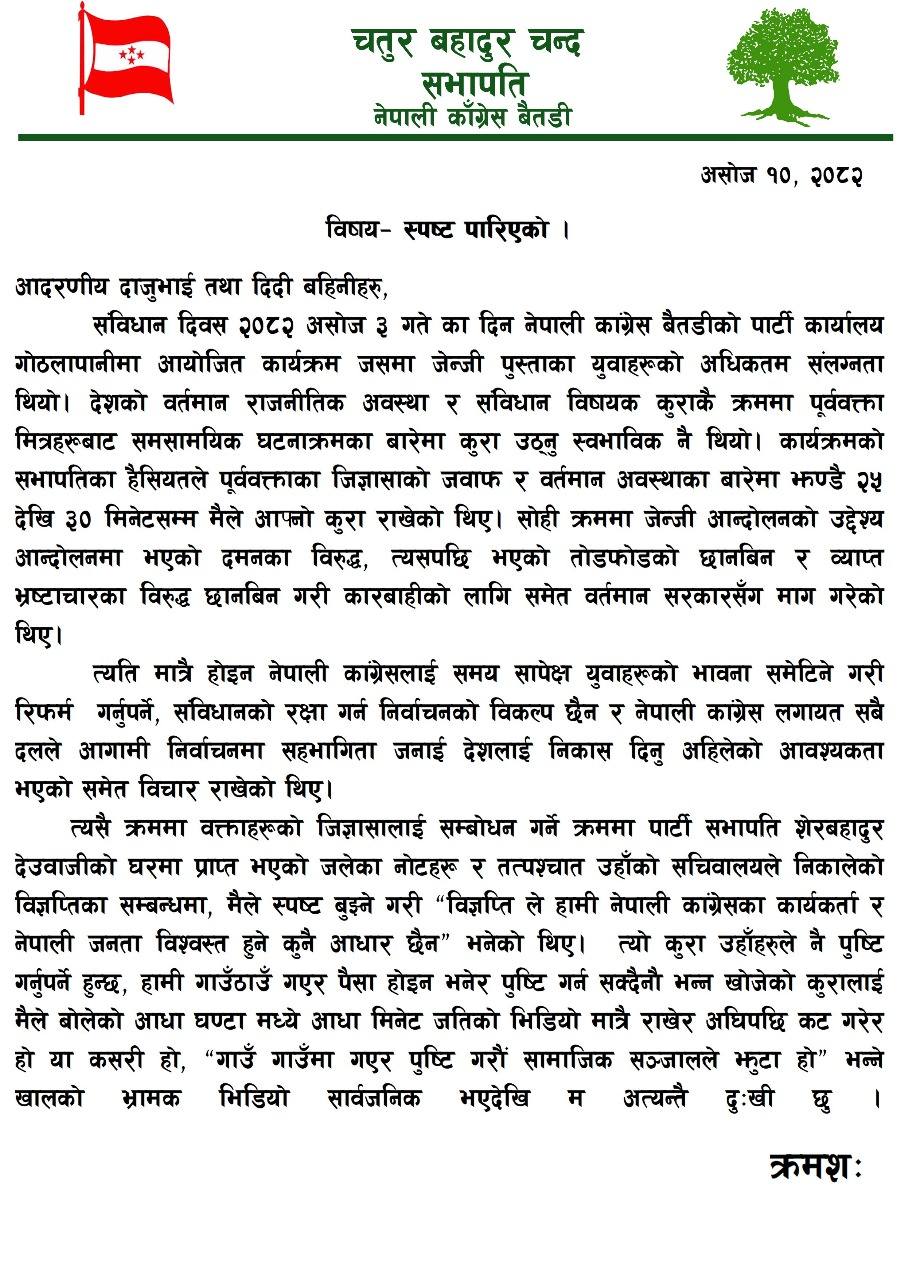 तर कतिपय वक्ताहरूको जिज्ञासालाई सम्बोधन गर्ने क्रममा पार्टी सभापति शेरबहादुर देउवाज्यूको कुरा आएको हुँदा सभापतीको सचिवालय निकालेको विज्ञप्तिको आधारमा, मैले भनेको कुरालाई लिएर कतिपय मिडियामा आएका समाचारहरू र सामाजिक सञ्जालमा आएका छोटकरीका क्लिपहरूले ठिक उल्टो अर्थ लगाई प्रचार गरिएको हुँदा म पार्टी सभापति देउवाज्यूको अपमान गर्ने कुरा मेरो कुनै पनि सोच थिएन र छैन भन्ने कुरा स्पष्ट पार्न चाहन्छु ।