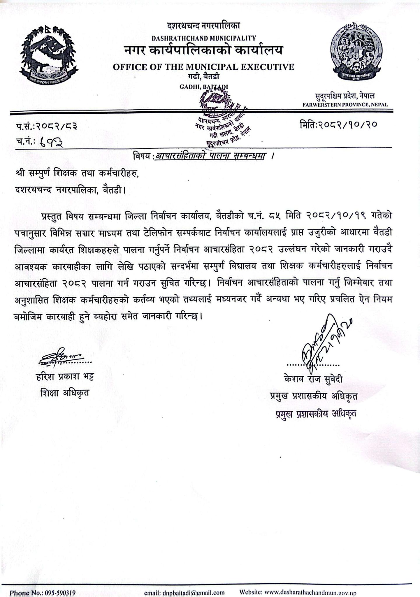 दशरथचन्द नगरपालिकाले एक सूचना जारी गर्दै निर्वाचन कार्यालयमा शिक्षकहरु निर्वाचन आचारसंहिता पालना नभएको उजुरी परेकाले परेको जनाएको छ । निर्वाचन कार्यालयले स्थानीय तहहरुलाई शिक्षकलाई निर्वाचन आचारसंहिता २०८२ पालनाका लागि पत्रचार गरेको छ । सो अनुसार दशरथचन्द नगरपालिकाले शिक्षकहरुको ध्यानाकर्षण गराएको छ ।